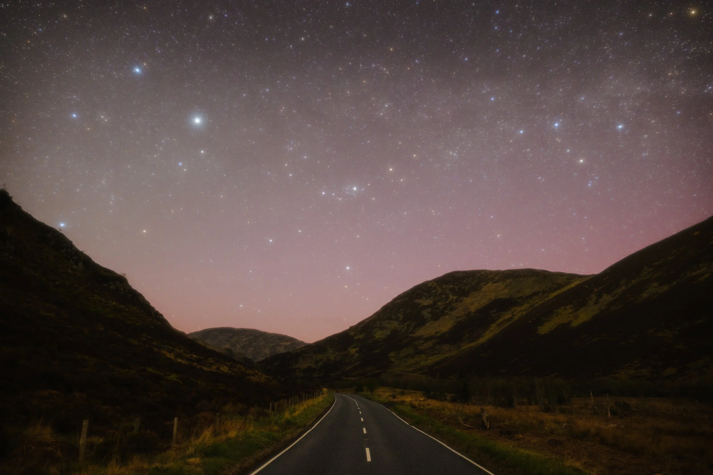 I obtained this picture in the village of Dunning, Perthshire. Because it was clear the second time I arrived here last night, I got immediately to concerning myself with shooting the sky and not the foreground first (cloud could scupper my shot at any moment). This is generally speaking, the way to go about taking shots such as these. I used a Nikon Z8 with a Tamron 35/1.4 lens. This is a spectacularly well corrected lens on starlight, which can be shot wide open at f/1.4 (which is exactly what I did, because cloud was an issue last night). A 35mm f/1.4 lens isn’t always associated with astrophotography (particularly with beginners), however it is an excellent lens to get tighter on deep sky objects, asterisms, constellations, and the milky way. How I used it last night, was to make a panoramic image to encompase the same field of view as the foreground would end up being. I did 30s exposures in vertical orientation, ISO 800 at f/1.4. I took five of these, with generous overlaps. This was all done on my polar aligned Star Adventurer tracker mount, in order that I got perfect stars right into the corners, and great detail.