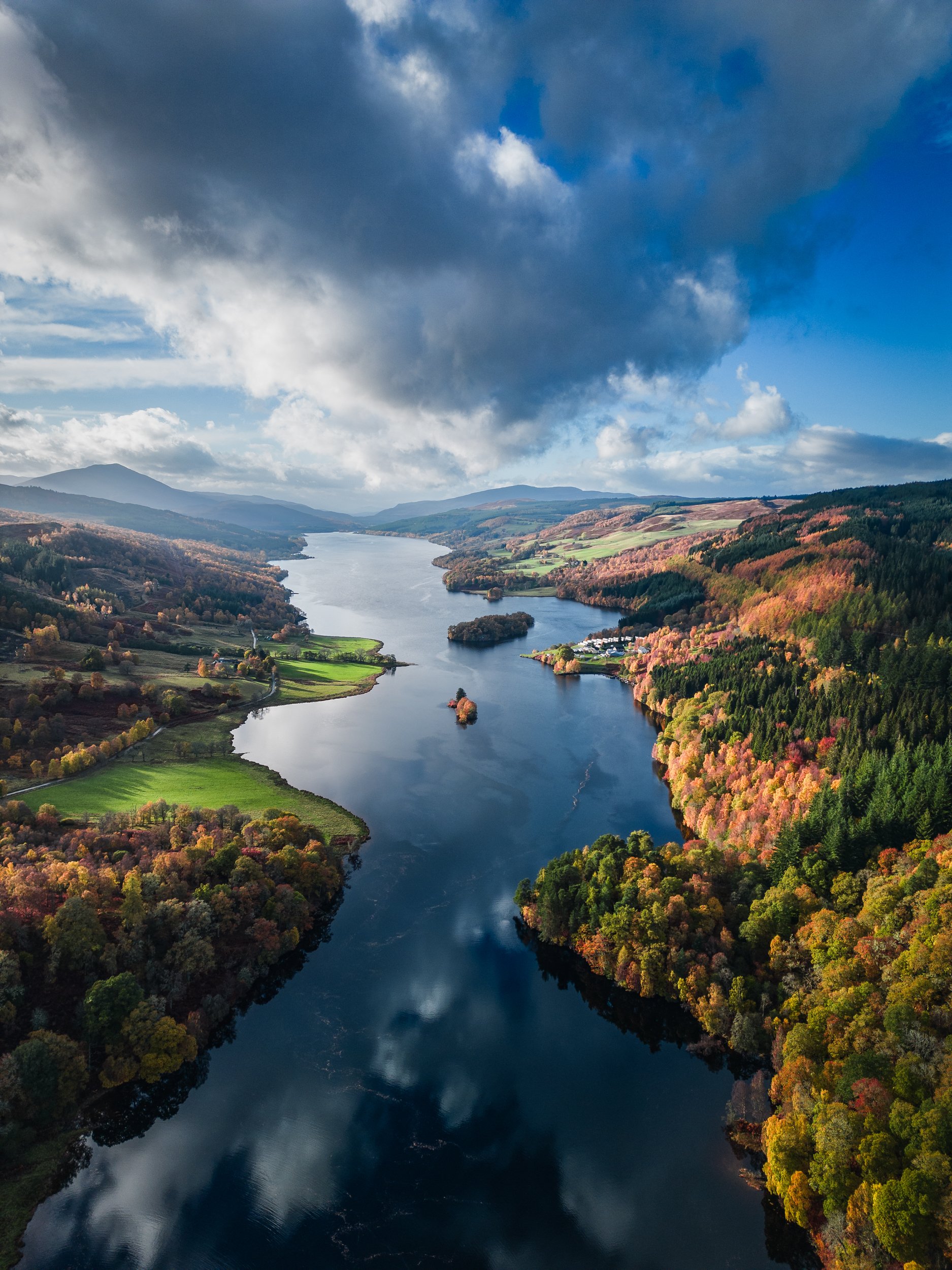 Aerial photography literally gives us a diferent point of view anyway, over ground based landscape photography. So therefore, in autumn it can let us even further accentuate the landscape from an aerial perspective. I very rarely shoot drone photographs straight down, as most of the time I find them quite uninspiring. Note in the above picture, again shot for realism, I have not overly tamed the highlights. Nothing is burned out here, however I have left the sky realistic: large, bold and bright. with a nice strong central-based cloud. A very simple composition here, all centralised. This was a two shot bracket, which was blended using luminosity masking in Photoshop.