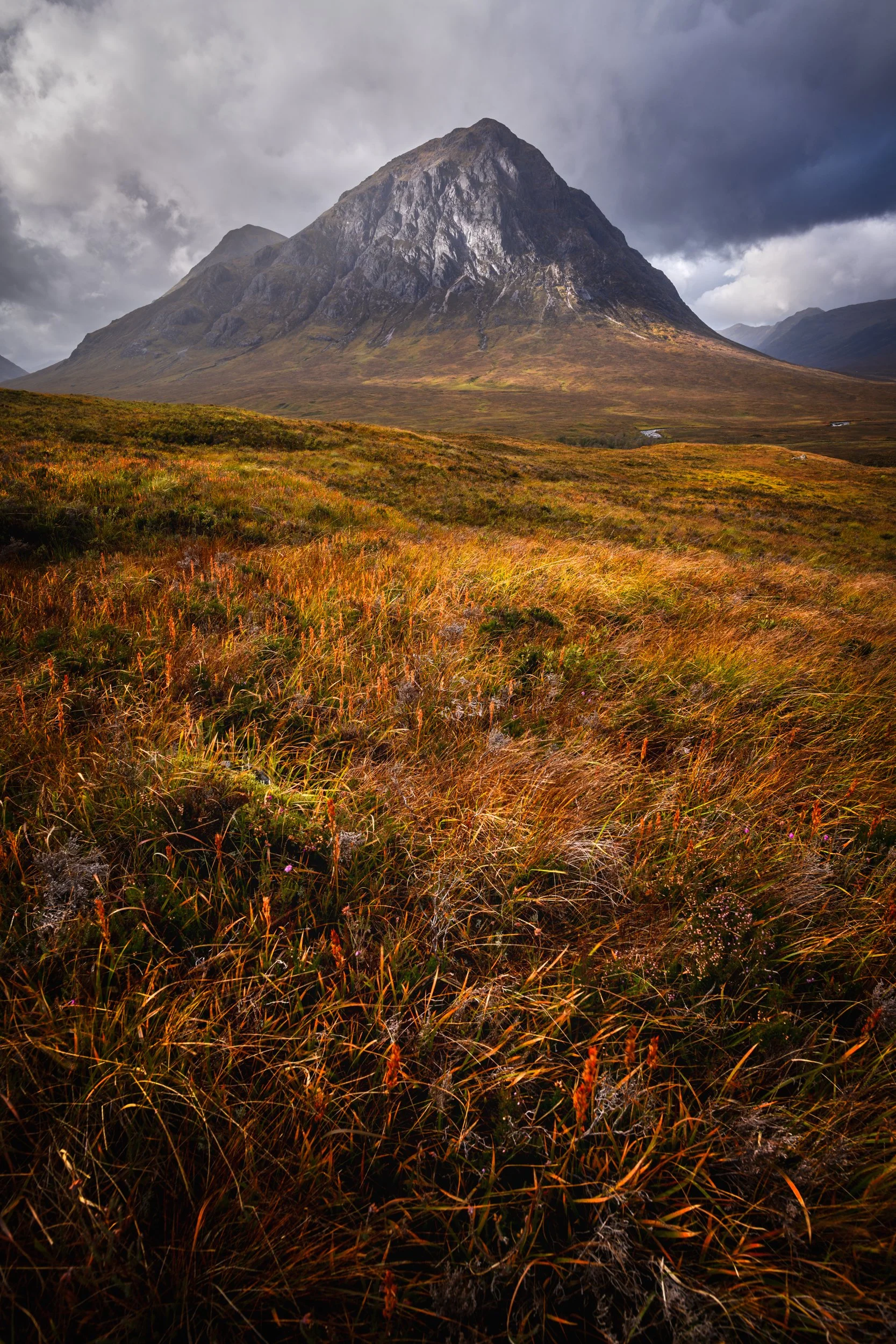 As often with photography, sometimes the simplest compositions with a bit of directional light make the most overall impact. For the above picture; there are no long exposure tricks, just a great location, light and moment. This image was just a waiting game, albeit a long one. I set up the composition and I simply waited until we got some light on Buachaille Etive Mòr, Scotland’s most famous mountain. The heather in the foreground and grasses are lit by soft dappled light which leads us right up to the mountain in the distance. This shot would not really have suited a bright blue sky, so the overall conditions made sense for the shot.