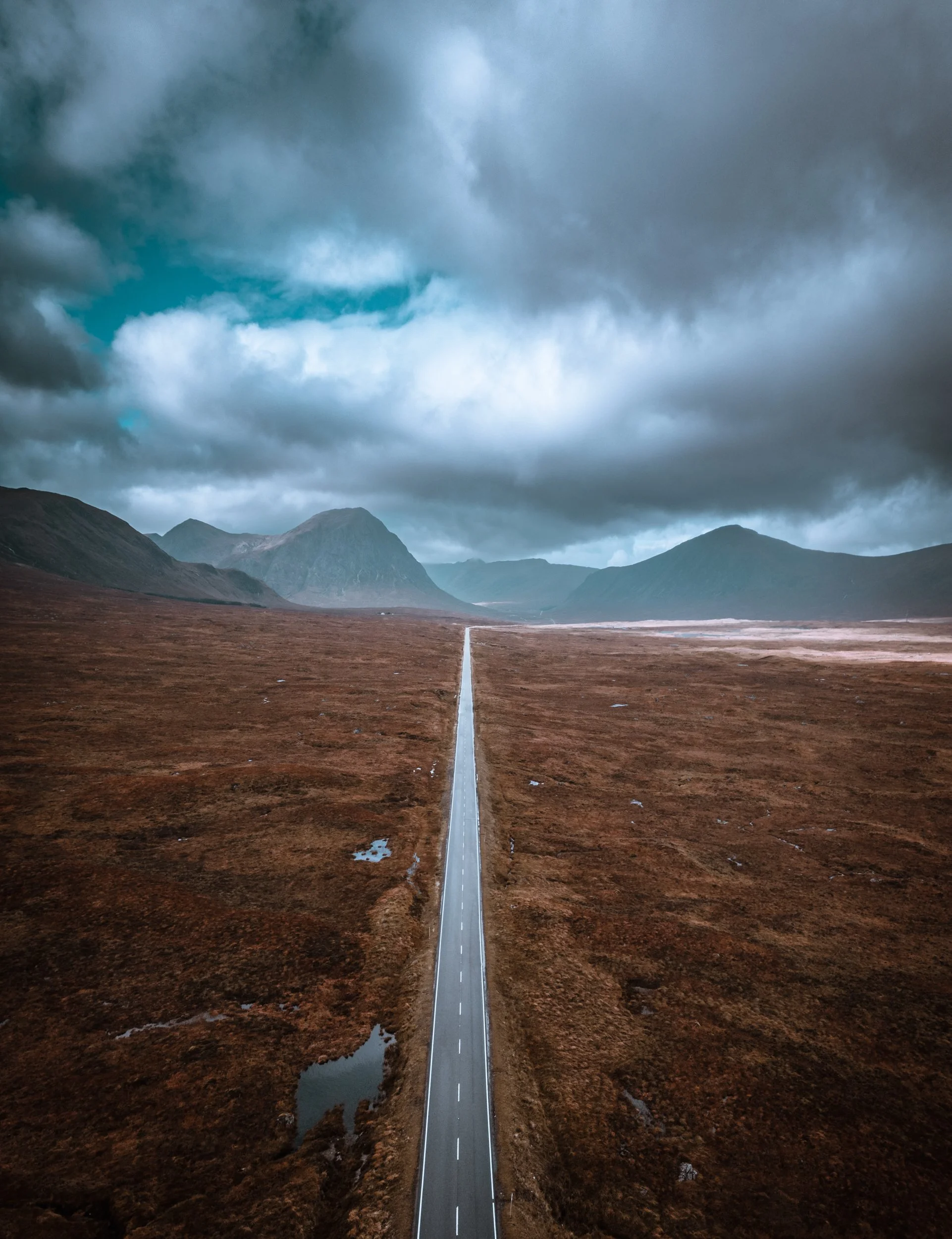 In this shot, you might be able to find a little animal. I am going to admit that I did not see this when taking the shot on the monitor. However, it was a pleasant surprize. Again, a very simple shot depicting the extreme flatness and desolation of Rannoch Moor, vs the glacial landscape of Glencoe. If you want to learn how to shoot captivating aerial photography, click here.
