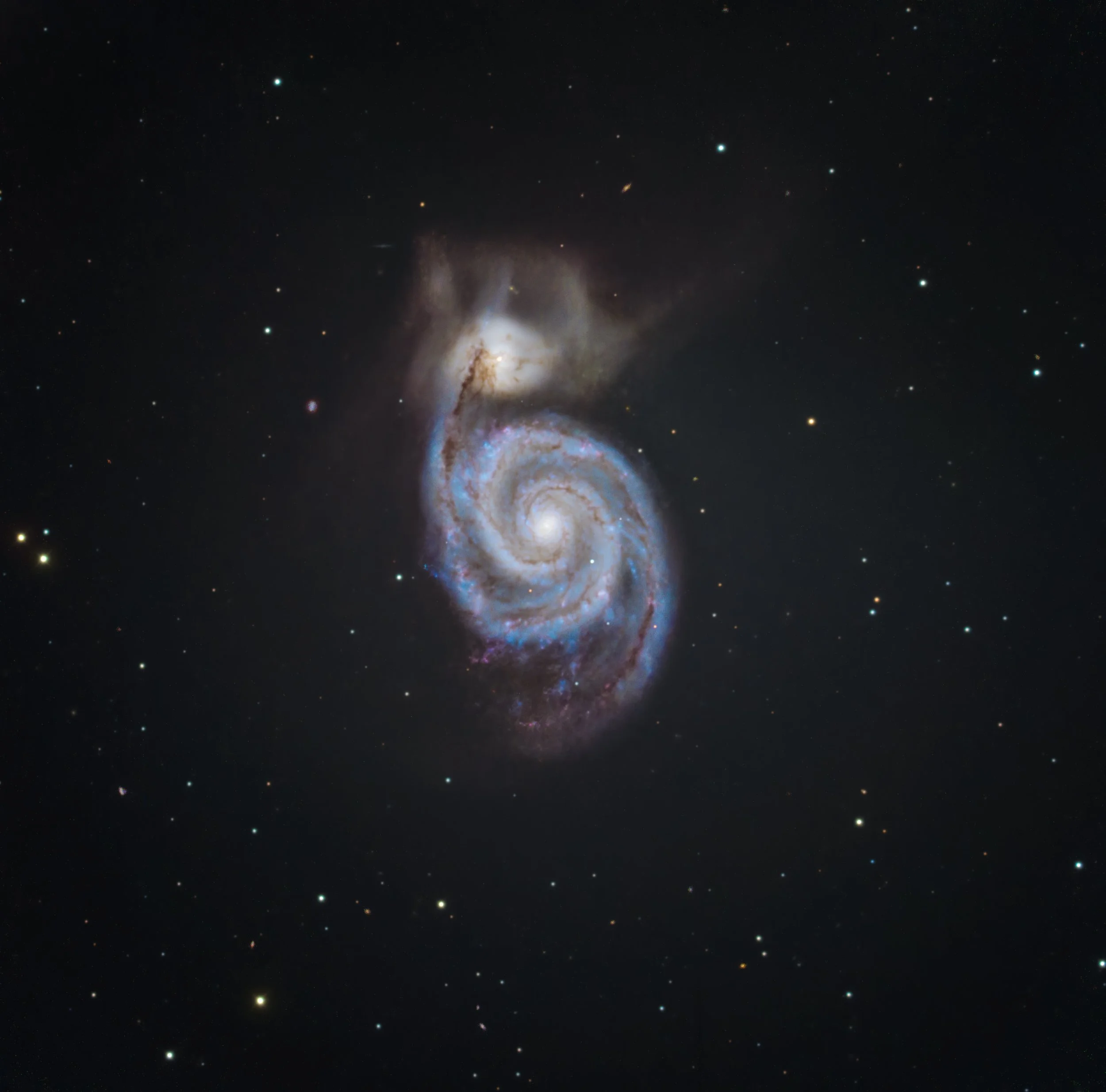 At the end of the stacking process, deep sky stacker kicks out a stacked tiff file containing huge amounts of data in a linear form. This file will look almost utterly black most of the time, and will next undergo a process we call stretching. Because my initial example picture is very old now, and the data is limited, I have opted to show you on something much newer from the Whirlpool Galaxy, which lies at 23 Million light years from us. This will allow me to show you the dramatic effect processing has, and how careful one must go about it to achieve the best results.