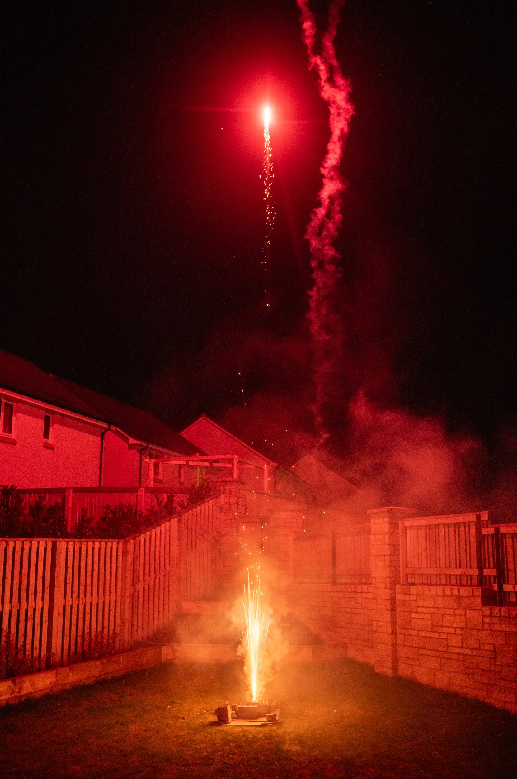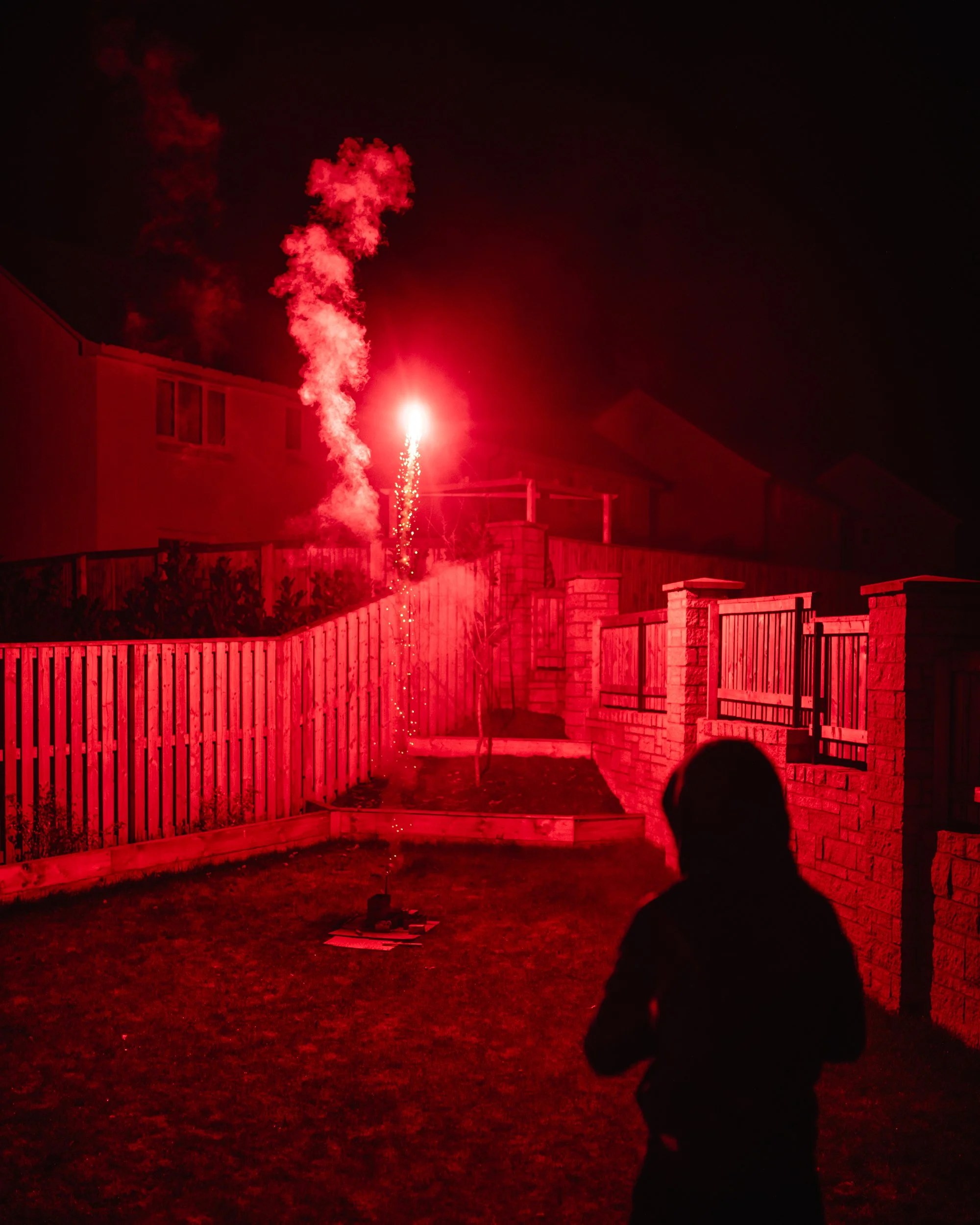 You can see from the picture above, that it is quite unique to be able to capture the actual rocket itself as it flies upwards into the night sky. I don’t see many doing this. This was shot with a Nikon D810 at ISO 400, f/1.4 and 1/200. I shot at this faster shutter speed, in order to freeze the motion of the rocket better than a slower speed would have done. Using large aperture lenses such as these allows us to add in a beautiful depth of field and fall off into the background which in my opinion, further adds to the shot overall. I love the little sparks that are evident around this picture, and the phenomenally beautiful glow from the flashes of light diffused through the smoke. It really produces a very different type of picture to the normal firework shots we are used to seeing over and over.